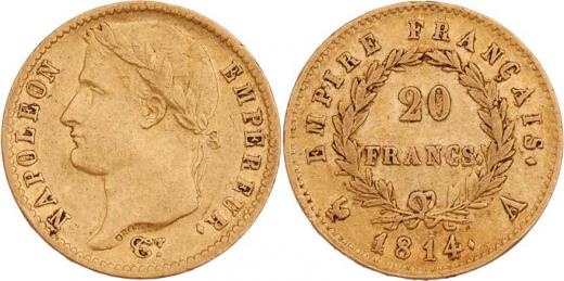 20 Frank 1814 A, Paříž, KM.695.1 (Au900), 6.353g, dr.hr., dr.rysky, pěkná patina