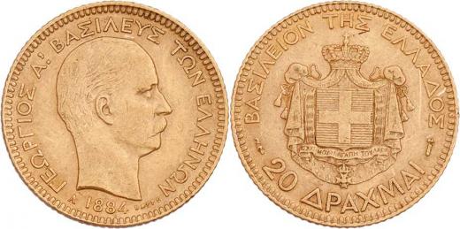 20 Drachma 1884 A, KM.56 (Au900), 6.430g, nep.hr., škr., nep.rysky, téměř