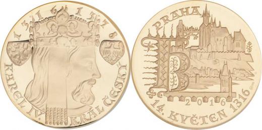 10-dukát. medaile 2016 - 700 let narození Karla IV. - hlava zprava, znaky, opis / pohled na Prahu, písmo, Punc., Au986, 42mm, 34.265g, kapsle, etue, 19ks, č.18