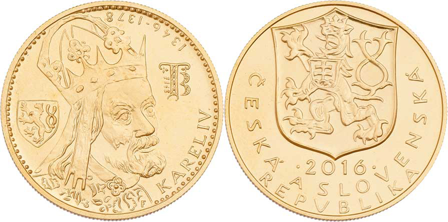 2-dukát. medaile 2016 - 700 let narození Karla IV. - hlava zprava, znak, monogram, opis / znak ČSR, písmo, Au986, 25mm, 6.995g, etue, osvědčení PÚ SR, č.85