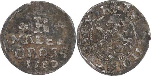 Malý groš 1580, Praha-Gebhart, HN.7a (opis 6a), nápis ". MALEY ./. GROSS ./. 1580 .", 0.902g, vada materiálu na hraně, nedor., patina R!