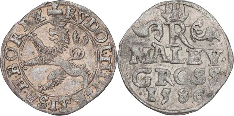 Malý groš 1586, Praha-Ercker, HN.21 (opis 6e), nápis ". MALEY ./. GROSS ./. 1586 .", 1.034g, nep.nedor., pěkná patina