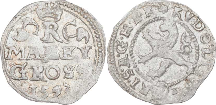 Malý groš 1593, K.Hora-Herold, HN.8 (opis 7a), nápis " MALEY / GROSS / 1593 ", 0.845g, nep.nedor., pěkná patina