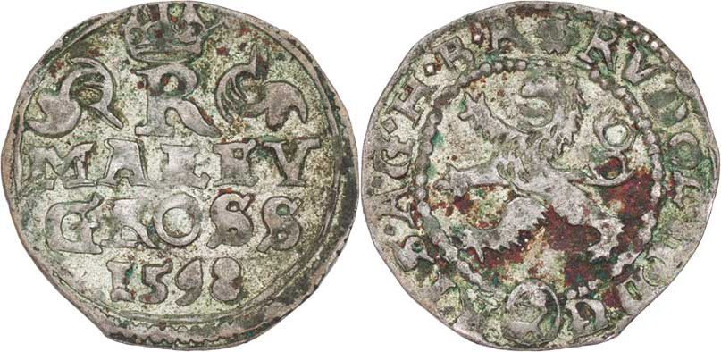 Malý groš 1598, K.Hora-Dominik, HN.8 (opis 7a), nápis " MALEY / GROSS / 1598 ", 1.038g, nep.nedor., skvrny, patina, téměř