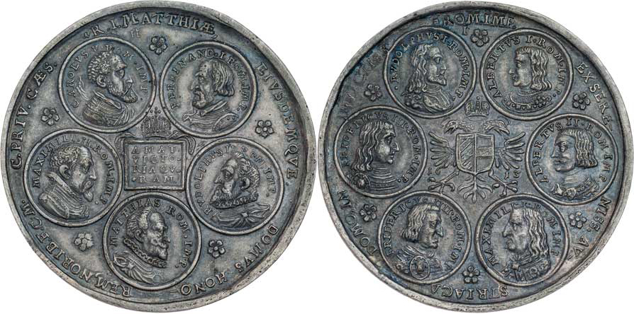 Medaile na 11 císařů Habsburského rodu 1613 - pět portrétů, tabulka s nápisem, opis / šest portrétů, znak, opis, lité Ag 45mm, 30.127g, Don.1871 RRR!
