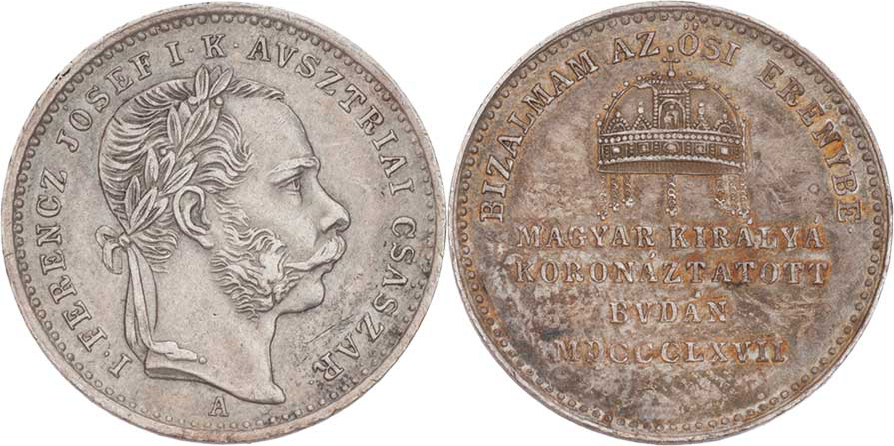 Menší maďarský peníz na korunovaci v Budíně 8.6.1867 - poprsí zprava, opis / koruna, opis a 4-řádk. nápis, Ag 20mm, 3.275g, M.2710, H.3795, Nov.B.6b, pat., tém.
