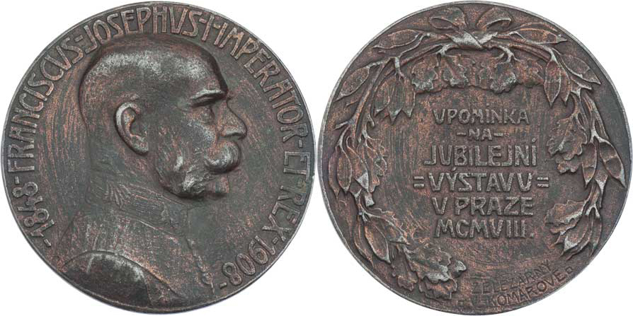 Železárny Komárov - upomínka na jubil. výstavu 1908 - poprsí zprava, opis / nápis ve věnci z vavřínu a dubu, měděně patinované lité železo 60 mm