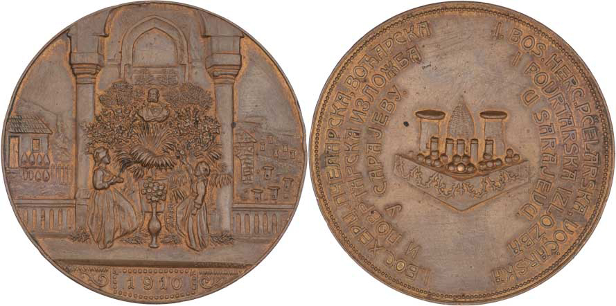 Christlbauer - Sarajevo k 80.narozeninám 1830/1910 - dívky zdobí pomník císaře, vročení / úly a ovoce, tři opisy, Sign., bronz 60 mm, hrany, vl.škr., patina RR!