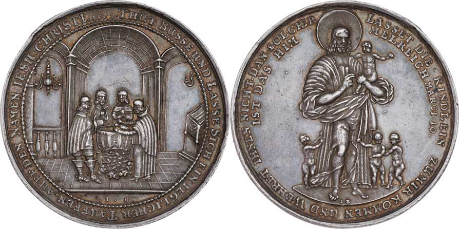 Buchheim ve Vratislavi (Sign.IB) - Kristus s dětmi, německé opisy / křest dítěte v chrámu, německý opis, b.l. (1660), Ag 53mm, 39.785g, nep.hr., nep.rysky R!