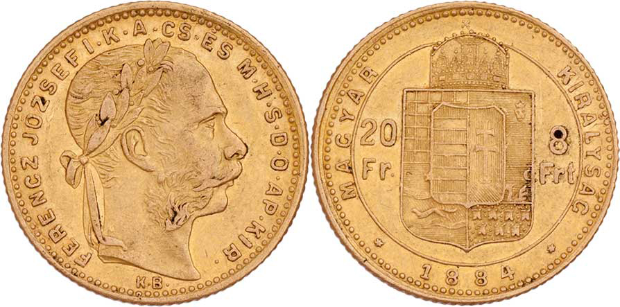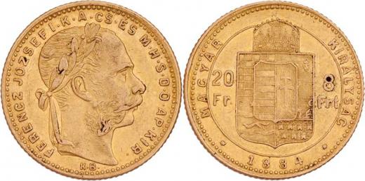 8 Zlatník 1884 KB, 6.433g, nep.hr., nep.rysky, skvrnka, patina, téměř