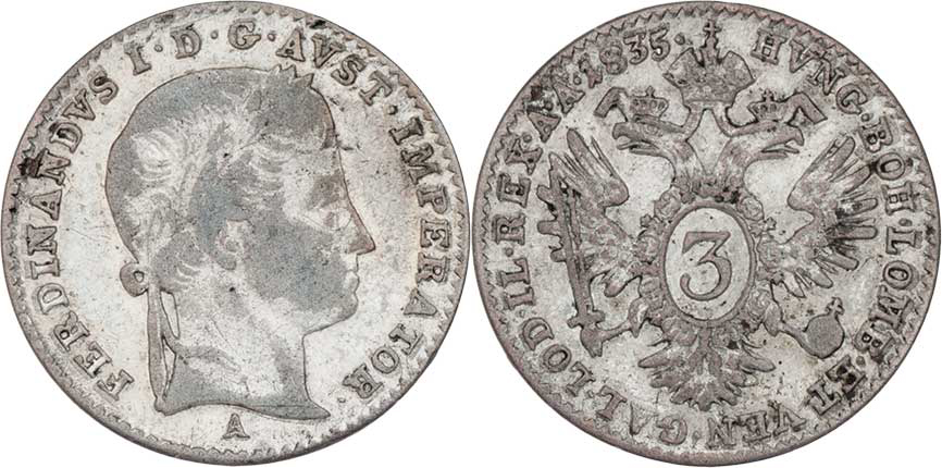 3 Krejcar 1835 A - FERDINANDVS, 1.656g, dr.hr., dr.rysky, patina R!