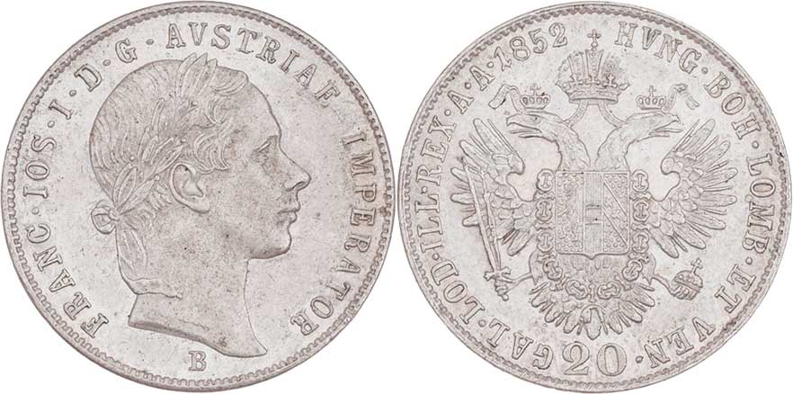 20 Krejcar 1852 B, 4.320g, dr.hr., nep.rysky, pěkná patina, téměř