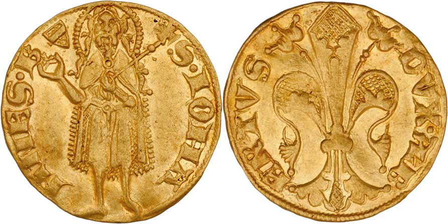 Florén b.l., stojící svatý Jan Křtitel zpředu, opis / stylizovaná lilie, opis, znak Vídně na konci opisu, Fr.1, Sa.636 (obr.248), CNA1.E.1, 3.493g, zvlněný R!