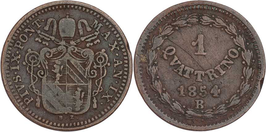 Quattrino 1854 B - IX.rok pontifikátu, Bologna, KM.1359, Berm.3329, 1.981g, hr., škr., nep.rysky, pěkná patina R!