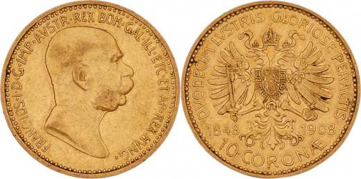 10 Koruna 1908 - jubilejní, 3.378g, nep.rysky, patina