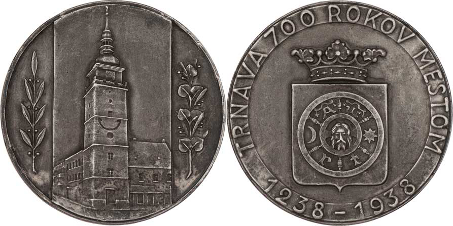 Trnava - na paměť 700.výročí povýšení na město 1938 - radnice, vavřínová a lipová ratolest / městský znak, opis, Nesign., Punc., pat. Ag987, 40mm, 29.250g, hr.