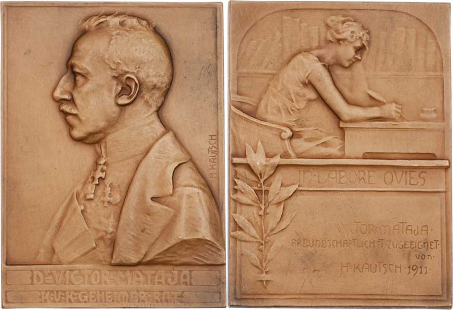 Dr.Victor Mataja - c.k.tajný rada 1911 - poprsí zleva a nápis / píšící múza a 4-řádkový nápis, Sign., patinovaný bronz 47x65 mm