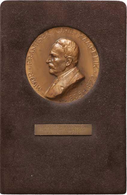MUDr.František Cyril Kampelík (1805 - 1872) b.l. - poprsí zleva, vysoký reliéf, opis/ český znak, nápis, Sign., bronz 80mm, stoj. s věnov."Josefu Kubovičovi"