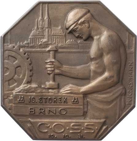 ČOSS (Čsl. odborný spolek slévárenský) - 8.sjezd 1931 v Brně - slévač při práci, ozubené kolo, pohled na katedrálu, 4-řádkový nápis, Sign., litina 123x128 mm