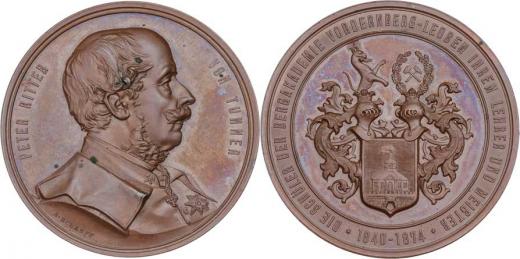 Peter von Tunner - profesor hornické akademie 1874 - poprsí zprava, opis / znak s dvěma přilbicemi, opis, Sign., měď 46 mm, nep.skvrnky, krásná patina