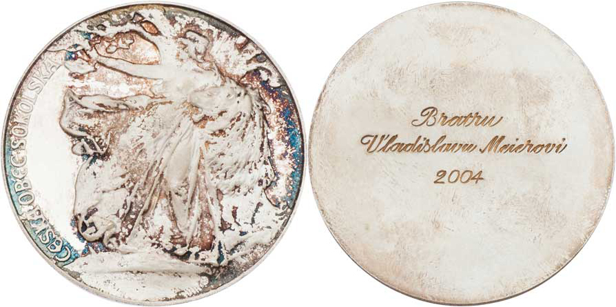 Česká obec sokolská - novoražba b.l. (udělení 2004) - postava Republiky se lvem a lípou, opis, Sign., znač. minc.Kremnica, jednostranný postříbřený bronz 50 mm