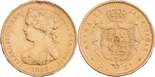 10 Escudos 1868/1868, Madrid, KM.636.1 (6-hroté hvězdy, Au900), 8.354g, velké hrany, rysky, pěkná patina