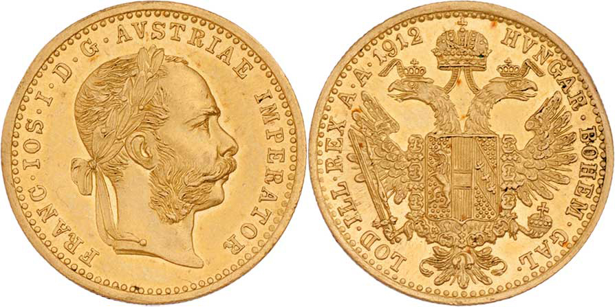 Dukát 1912, 3.487g, na hraně stopa po zkoušce kovu, nep.hr., nep.rysky, patina, téměř