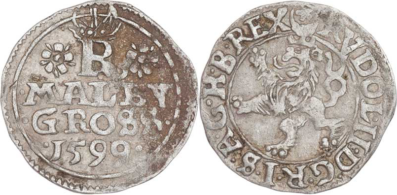 Malý groš 1599, Jáchymov-Hoffmann, HN.8b (opis 7c), nápis ". MALEY ./. GROSS ./. 1599 .", 0.946g, nep.nedor., pěkná patina