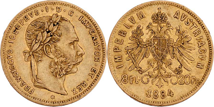 8 Zlatník 1884 (pouze 91.000 ks), 6.427g, nep.hr., nep.rysky, pěkná patina
