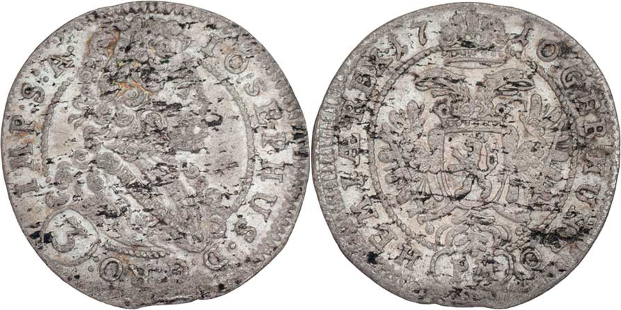 3 Krejcar 1710, Praha-provizorium, J.7a, MKČ.1723, 1.737g, krajový střížek, dr.vady mater., pěkná patina
