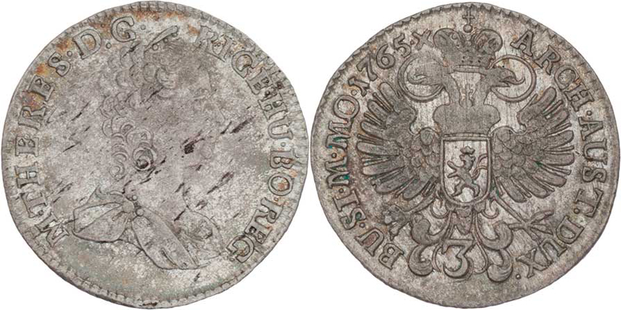 3 Krejcar 1765, Praha-Erdmann, N.37, MKČ.1972-1973, 1.678g, nep.vady mater., nep.just., skvrnky, patina