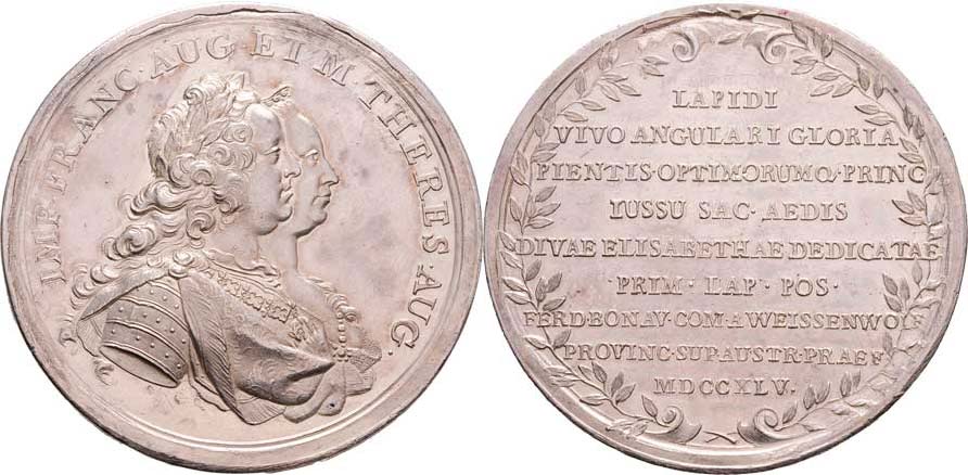 AR medaile na založení kláštera sv.Kateřiny v Linci 1745 - dvojportrét, opis / 9-řádkový nápis, Nesign. (Donner), 49mm, 34.944g, H.2883, vada mat., nep.rysky