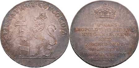 Větší jeton na korunovaci v Praze 6.9.1791 - lev se znakem a křížem, opis / koruna a nápis, Ag 25mm, 4.395g, Nov.Q.3b, ČS.1431, patina, krásný podl.lístek