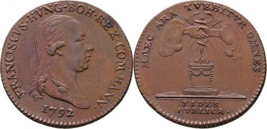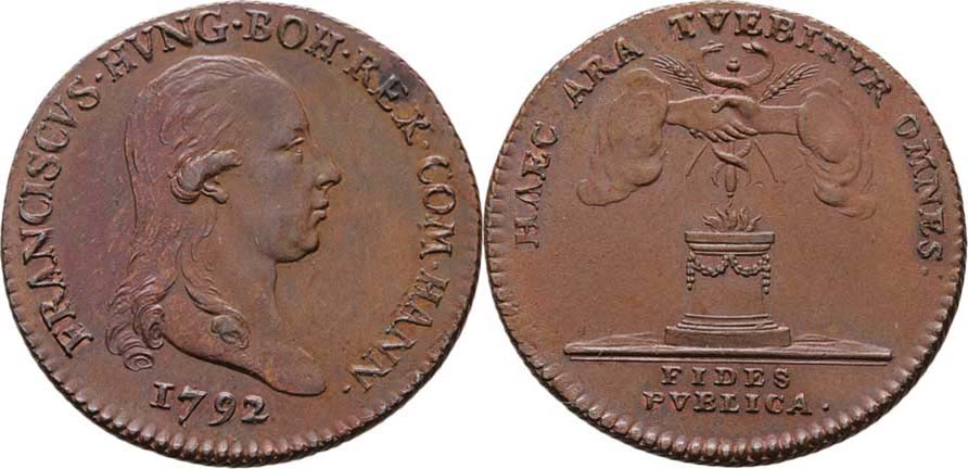 AE menší jeton na holdování v Hennegau 1792 - poprsí zprava, opis/ ruce spojené nad oltářem, opis a nápis, Nesign., měď 22 mm, Nov.G.1c, M.2266, LG.XIV.1189