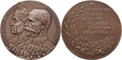Pavlik - AR medailka na zlatou svatbu 21.2.1902 - dvojportrét zleva, opis/ nápis, věnec z obilí a růží, zářící hvězda, Sign., Punc., 25mm, 6.194g, patina