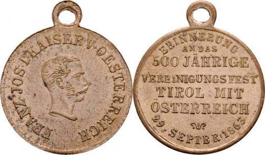 Nesign. - 500 let unie Tyrolska s Rakouskem 29.9.1863 - hlava zprava, německý opis / 7-řádkový nápis, postř.bronz 22 mm s raženým ouškem, Haus.1619, patina