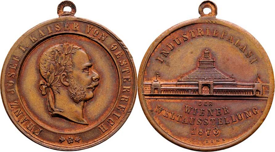 Nesign. - Světová výstava ve Vídni 1873 - portrét zprava, opis / výstavní pavilón Rotunda, 5-řádkový nápis, Sign., bronz 30mm s pův.ouškem, dr.hr., patina