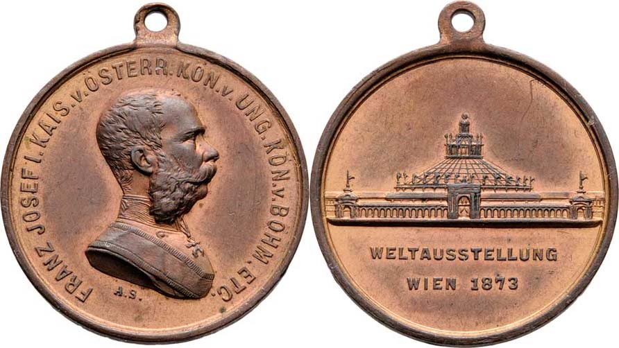 Scharff - Světová výstava ve Vídni 1873 - portrét zprava, opis/ výstavní pavilón Rotunda, 2-řádk.nápis, Sign., měď 27 mm s původ.ouškem, stopy zlacení, téměř