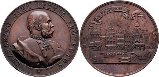 Christlbauer - výstava divadla a hudby ve Vídni 1892 - poprsí zprava, nápisy / historické budovy, nápis na stuze, Sign., Punc., měď 42mm, Haus.3004, hr., téměř