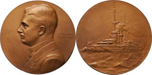 Hartig - Podpůrný spolek námořnictva 1914/1915 - poprsí zleva, 2-řádkový nápis / křižník zleva, opis, Sign., patinov. bronz 60 mm, původní etue