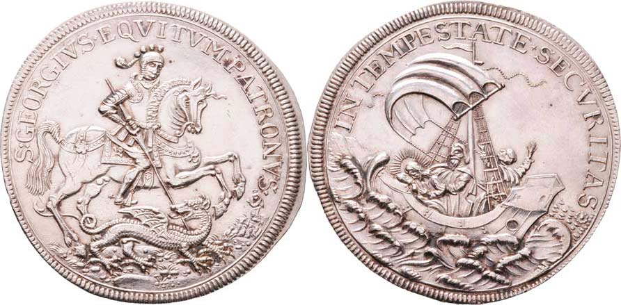 Sv.Jiří na koni bojuje s drakem, latinský opis / loď v bouři, latinský opis, Ag 45mm, 27.091g