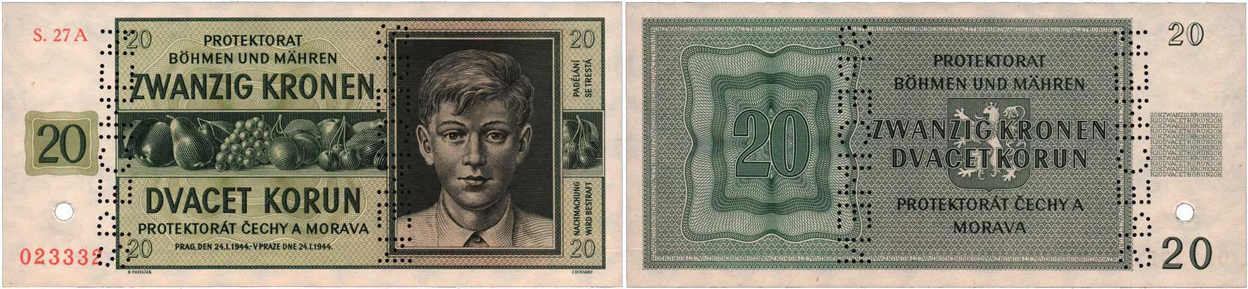 20 Koruna 1944 - série 27A, BHK.40a, jako Kar.35 - bankovní vzor - dvakrát svisle perforováno "SPECIMEN" + 1 díra 5 mm R!