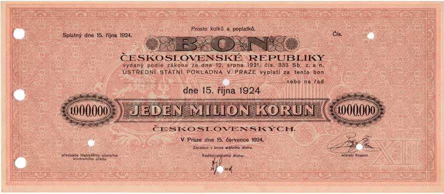 Bon ČSR ze dne 17.07.1924 na 1.000.000 Korun, perfor. 3x6mm a 4x4 mm, v podtisku římské číslo XII