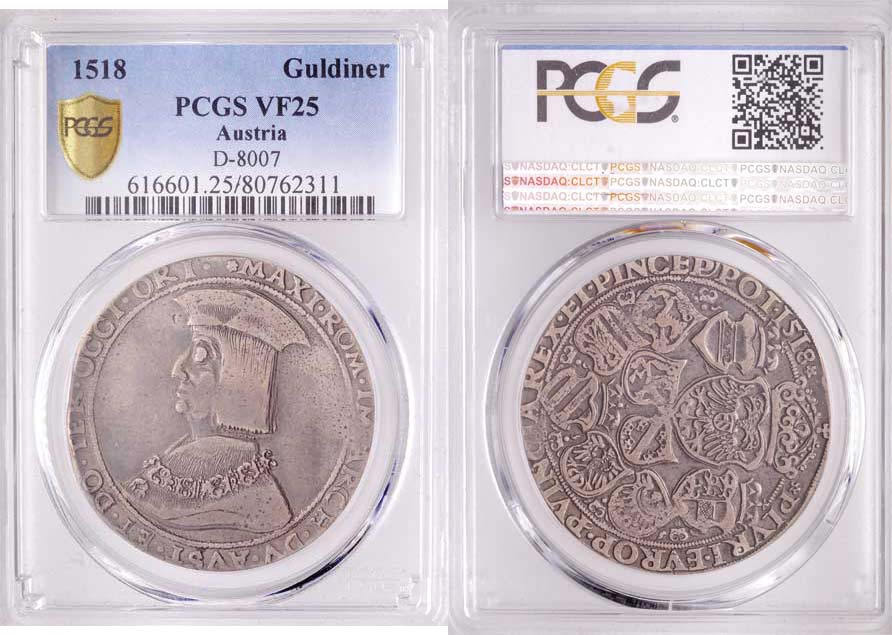 Tolar 1518 - císař zleva v baretu, opis / císařský znak a znaky devíti zemí, opis, M.23, H.850, zataveno v etui PCGS, uvedena zachovalost VF25, patina RR!