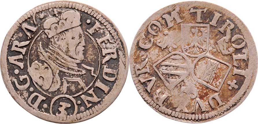 3 Krejcar b.l., Hall-Krump, M-A.49, M-T.241, opis končí "..TIROLI +", 2.261g, nedor., patina