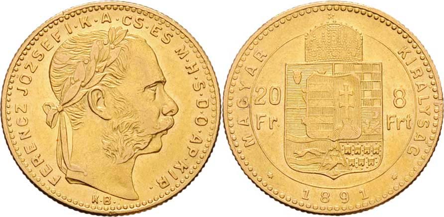 8 Zlatník 1891 KB - se znakem Rijeky, 6.422g, nep.hr., nep.rysky, téměř