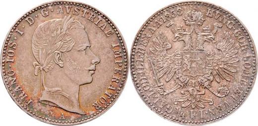1/4 Zlatník 1858 A - 1.typ (menší označení nominálu), 5.306g, nep.hr., nep.rysky, patina