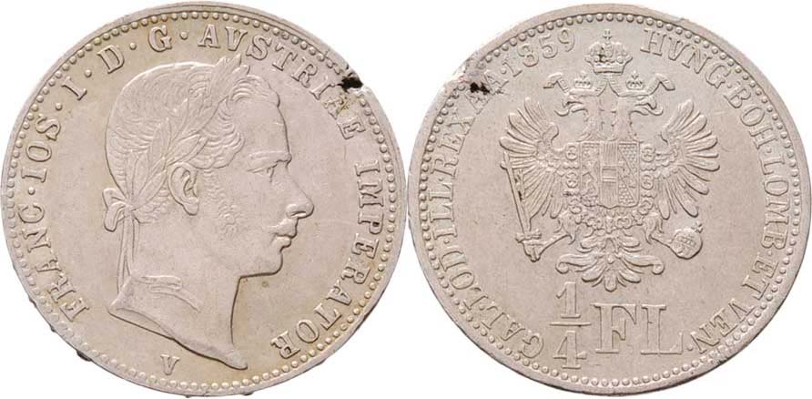 1/4 Zlatník 1859 V, 5.317g, vada materiálu na hraně, dr.hr., dr.rysky, patina R!