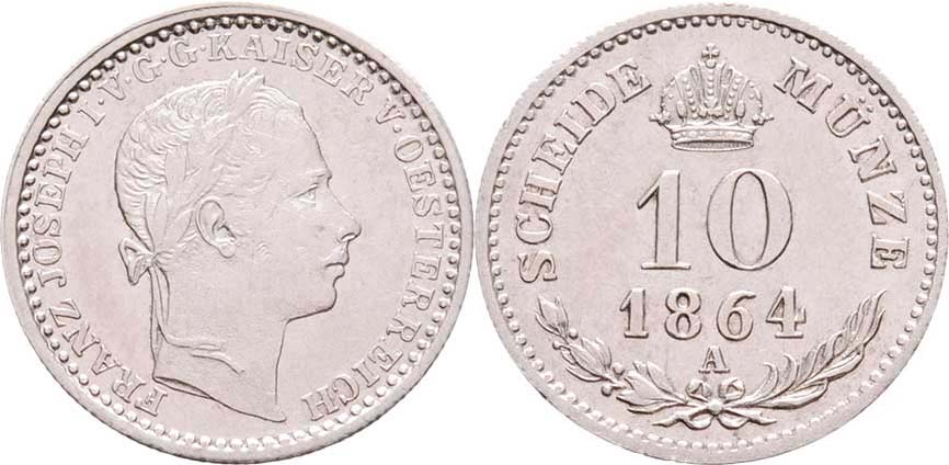 10 Krejcar 1864 A, 1.992g, nep.hr., nep.rysky R!