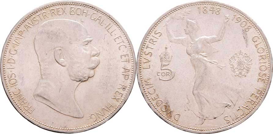 5 Koruna 1908 - jubilejní, 24.057g, nep.hr., dr.škr., nep.rysky, pěkná patina